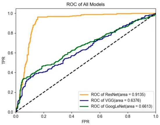 The performance of three deep-learning models in the testing data set is shown in Table 3. ResNet had the best diagnostic performance, with an AUC value of 0.91, an accuracy value of 95.3%, a sensitivity value of 96.2%, a specificity value of 94.7%, a PPV of 93.1%, and an NPV of 97.1% in the testing data set. GoogLeNet yielded an AUC value of 0.66, an accuracy value of 76.0%, a sensitivity value of 66.6%, a specificity value of 96.1%, a PPV of 97.1%, and an NPV of 59.4%. Lastly, VGG yielded an AUC value of 0.64, an accuracy value of 73.7%, a sensitivity value of 63.6%, a specificity value of 94.4%, a PPV of 95.1%, and an NPV of 56.8% in the testing data set. The ROC curves of the deep-learning models are shown in Figure 6. In addition, after including lesion size and age in the ResNet model, we found a slightly enhanced diagnostic performance value, specifically an AUC value of 0.94, an accuracy value of 96.4%, a sensitivity value of 95.9%, and a specificity value of 96.8% in the testing data set.