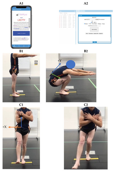 The TelePhysio app that is installed on the participant’s smartphone (A1) and the web-based interface (A2) that is controlled from the clinician’s web browser. Double-leg (B1,B2) and single-leg (C1,C2) squat tasks. Smartphone inside the black pouch strapped around the waist at the lower back. Arrows indicate the smartphone accelerometer axes.