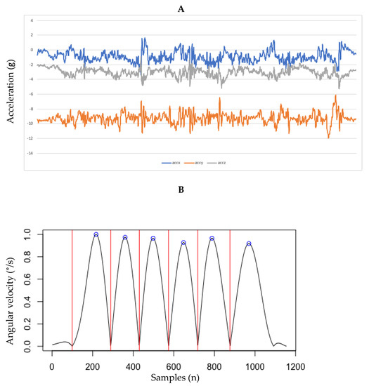 (A) Raw acceleration in x, y, and z direction (accx, accy, and accz, respectively, and (B) identification of squat repetition using angular velocity. Angular velocity was processed by first filtering with a Butterworth lowpass filter (10 Hz, 4th order, and zerolag), followed by rectifying the signal and normalizing it to its maximum peak value. The first red vertical line represents the beginning of the squat by lowering the body. The second red vertical line represents raising the body. The last vertical line represents the end of the 3 squat repetitions.