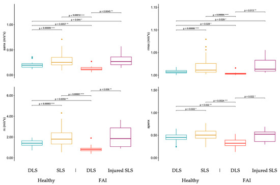 Smartphone sway measurements on the sagittal axis (x, medio-lateral) for double-leg squats (DLS) and single-leg squats (SLS) in both healthy and FAI adult participants. The SLS for FAI participants is with the injured leg. Sway measurements include average acceleration magnitude from the mean (aamx), root-mean-square acceleration (rmsx), range acceleration (rx), and approximate entropy (apenx). *, **, ***, and **** denote p-values of p < 0.05, p < 0.01, p < 0.005, and p < 0.001, respectively.