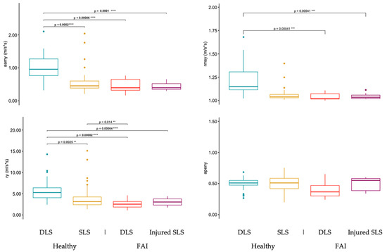 Figure 4 shows the TelePhysio sway measurements on the y-axis for the healthy DLS, healthy SLS, FAI DLS, and FAI-injured leg SLS conditions. The DLS condition in healthy controls showed significantly greater aamy, rmsy, and ry values (0.99 ± 0.39, 1.24 ± 0.24, and 5.73 ± 2.59, respectively) compared to healthy SLS (0.56 ± 0.31, 1.15 ± 0.55, and 4.10 ± 2.47, respectively), FAI DLS (0.46 ± 0.21, 1.04 ± 0.04, and 2.65 ± 1.08, respectively), and injured SLS (0.43 ± 0.12, 1.04 ± 0.02, and 3.05 ± 0.88, respectively).