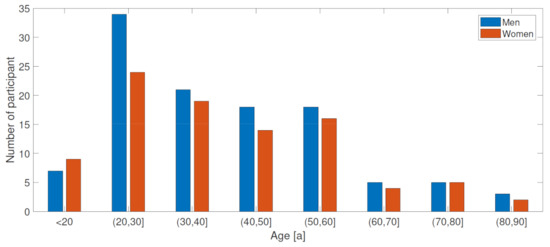 The absolute age distribution of the participants is shown in Figure 1. The relatively low proportion of subjects over 60 years of age can be explained by the inclusion/exclusion criteria, which required the absence of any pathological motor limitations or any artificial joint replacements.