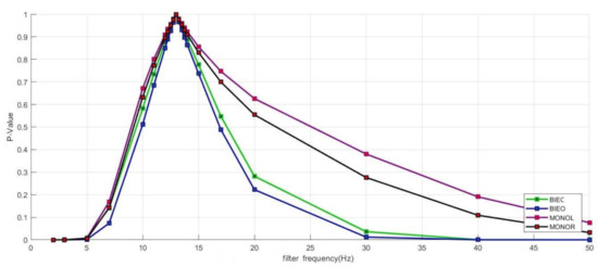 Below 5 Hz, all measurement conditions showed a p-value smaller than α = 0.05. The “bipedal stand” conditions provided a p-value smaller than α = 0.05 from 30 Hz. For the “monopedal stand” conditions, no α = 0.05 was found in the observation range up to 50 Hz.