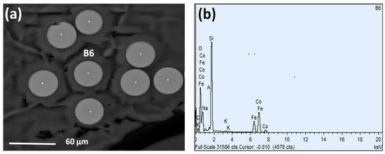 The cross section of selected Co2FeSi glass-coated microwires with aspect ratio 0.30 images (a) and the chemical composition spectra of EDX of one of the points (b).