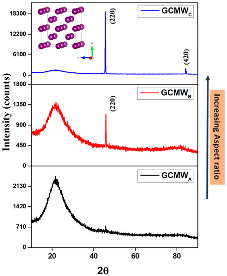 We estimated the lattice parameters of the two crystalline Co2FeSi glass-coated microwires, and then we employed the Debye-Scherrer’s equation, as presented in our previous work [23], to investigate the microstructure of Co2FeSi in greater depth. Using this methodology, we can estimate the average grain size, Dg, associated with the principal peaks, which is approximately 17.8 m, 37.6 nm, and 45.8 nm for GCMW**, GCMWB, and GCMWC of Co2FeSi microwires, respectively, as illustrated in Table 2. Thus, Dg has a monotonic increase with increasing the aspect ratio.
