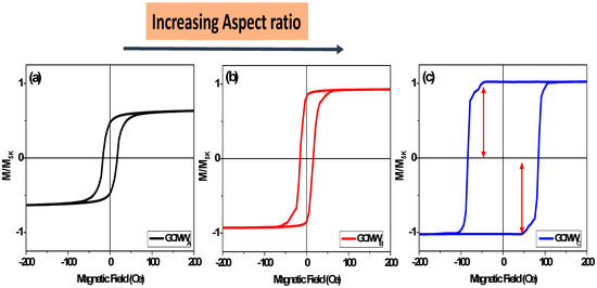 Figure 3 shows the magnetic hysteresis loops of Co2FeSi-glass-coated microwires with different ρ-ratios, obtained at room temperature with an applied magnetic field parallel to the microwire axis. All samples exhibit typical ferromagnetic behaviour, due to the high Curie point of Co2FeSi alloy greater than 1100 K [46]. The sample with a low ρ-ratio exhibits soft magnetic properties with coercivity, Hc, around 14 Oe, and a non-square hysteresis loop shape (Figure 3a). However, the sample with the largest ρ-ratio shows almost perfectly square hysteresis loops with higher Hc (about 87 Oe), than Co2FeSi with a low ρ-ratio (see Figure 3b,c). In addition, the hysteresis loop shows multistep magnetic behavior (indicated with arrows in Figure 3c). The almost square hysteresis loops for the GCMWC microwire with normalized remanent, Mr, near 0.96 indicates the axial character of magnetic anisotropy with the easy axis of magnetization along the direction of the applied magnetic field. Thus, the increase in ρ-ratio affects the magnetocrystalline anisotropy, and its direction has the same direction of (220) and (420), as illustrated in the structural section. However, in the sample GCMWB with a crystalline structure, non-perfectly square loops are observed. Such change in the hysteresis loop shape must be related to the presence of a considerable amount of amorphous phase beside the disordered B2 or little-ordered L21 structures. In our previous work at the same alloys, but with a low ρ-ratio (ρ = 0.26), the enhancement of the magnetocrystalline anisotropy, the squareness, and coercivity of Co2FeSi glass-coated microwires after annealing was observed [21,22,24]. As we illustrated in our previous work, the two main factors affecting the magnetic anisotropy behavior in Heusler-based glass-coated microwires are uniaxial magnetic anisotropy and cubic magnetocrystalline anisotropy [21,22,24]. By increasing the ρ-ratio, an enhancement in the crystalline phase content correlates with the magnetic property modification, i.e., the main factor controlling the magnetic anisotropy is the cubic magnetocrystalline anisotropy. Unfortunately, currently, we are not able to measure this type of anisotropy experimentally, but the perfectly square loop indicates its strong effect on the GCMWB and GCMWC samples. As seen in Figure 4, the GCMWc sample shows the highest anisotropy field Hk, coercivity Hc, and normalized remnant Mr. The odd behavior of Hk is likely related to the big amorphous phase present in GCMWA and GCMWB samples, as the behavior of Hc for these two samples is also quite similar (there is not a decrease, as in the case of the Hk, but the values are almost the same) and maybe the growth of the crystalline structure eases initially the reduction of the anisotropy field. In addition, the different types of microstructures (L21, B2, and A2) can also strongly affect the Hk behavior.