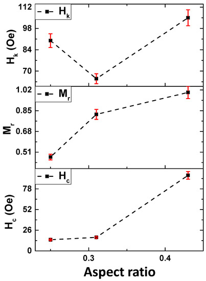 Aspect ratio dependence on coercivity (Hc), normalized remanence (Mr), and in –plane anisotropy field (Hk) of Co2FeSi glass-coated microwires (lines for eye guide).