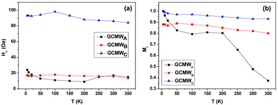 It is worth noting that the ferromagnetic materials temperature stability is a crucial characteristic for their possible applications in spintronic and sensing devices. Hence, for a wide range of measurement temperatures, 5–350 K, we investigated the magnetic behavior of Co2FeSi glass-coated microwires with different ρ-ratios. The shape of the loops follows the same trend observed at room temperature: non-square for the GCMWA sample, quite square for the GCMWB one, and almost square for the GCMWC one (loops not shown). In Figure 5, the evolution of Hc and Mr with the temperature is shown. This behavior demonstrates that for the GCMWC sample, cubic magnetocrystalline anisotropy prevails up to 350 K.
