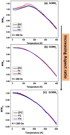 The magnetic behavior was studied in two different ways: hysteresis loops at temperatures between 5 and 350 K, and thermomagnetic curves following three different protocols, zero field cooling (ZFC), field cooling (FC), and field heating (FH) at the low magnetic field (H = 200 Oe). All magnetization curves were measured using a PPMS (Physical Property Magnetic System, Quantum Design Inc., San Diego, CA, USA) vibrating-sample magnetometer at temperatures, T, between 5 and 400 K for ZFC, FC, and FH magnetic curves. For the hysteresis loops, we only focus on the in-plane configuration where the applied magnetic field is parallel to the wire axis. The results are provided in terms of the normalized magnetization, M/M5K, where M5K is the magnetic moment obtained at 5 K to avoid misleading of the estimation of the errors in the estimation of the magnetization saturation values.