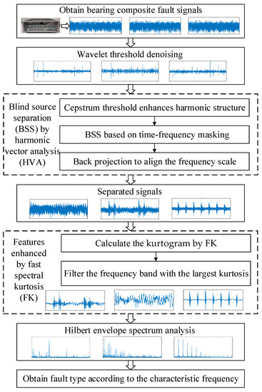 Composite fault diagnosis of rolling bearings is very challenging work, especially when the characteristic frequency ranges of different fault types overlap. To solve this problem, an enhanced harmonic vector analysis (EHVA) method was proposed. Firstly, the wavelet threshold (WT) denoising method is used to denoise the collected vibration signals to reduce the influence of noise. Next, harmonic vector analysis (HVA) is used to remove the convolution effect of the signal transmission path, and blind separation of fault signals is carried out. The cepstrum threshold is used in HVA to enhance the harmonic structure of the signal, and a Wiener-like mask will be constructed to make the separated signals more independent in each iteration. Then, the backward projection technique is used to align the frequency scale of the separated signals, and each fault signal can be obtained from composite fault diagnosis signals. Finally, to make the fault characteristics more prominent, a kurtogram was used to find the resonant frequency band of the separated signals by calculating its spectral kurtosis. Semi-physical simulation experiments are conducted using the rolling bearing fault experiment data to verify the effectiveness of the proposed method. The results show that the proposed method, EHVA, can effectively extract the composite faults of rolling bearings. Compared to fast independent component analysis (FICA) and traditional HVA, EHVA improves separation accuracy, enhances fault characteristics, and has higher accuracy and efficiency compared to fast multichannel blind deconvolution (FMBD).