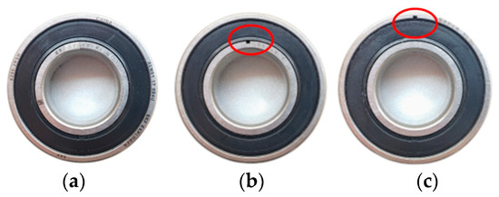 Pictures of test rolling bearing. (a) Normal rolling bearing. (b) Inner race fault rolling bearing. (c) Outer race fault rolling bearing. In the red circle, they are the location of fault of rolling bearing.