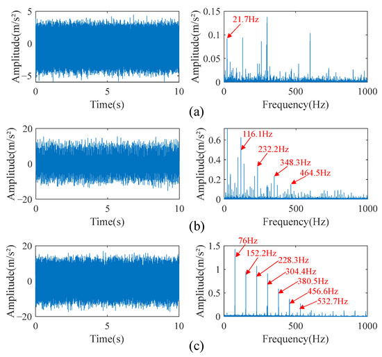In Figure 7, it can be seen that the inner race fault and outer race fault cause shock waveforms in the time domain. In the frequency domain of the inner race fault signal, there are obvious fault characteristics at the frequency harmonic of 116.1 Hz and its higher harmonics of 232.2 Hz, 348.3 Hz, and 464.5 Hz; their amplitudes decrease gradually. In addition, there is a fundamental frequency of 21.7 Hz on the envelope spectrum, and there is a side frequency band separated by the fundamental frequency around the fault characteristic frequency harmonic and its higher harmonics, which is a typical frequency domain characteristic of rolling bearing fault signal. The characteristic frequency harmonic of the outer race fault is 76 Hz, and its frequency domain characteristics are similar to those of the inner race fault. The difference is that the amplitudes of the characteristic frequency harmonic and its higher harmonics of the outer race fault signal are higher, while the amplitudes of the fundamental frequency and side frequency band are relatively weak. The only prominent frequency components in the normal signal envelope spectrum are the fundamental frequency and its higher harmonics, as well as some unknown high-frequency shocks.