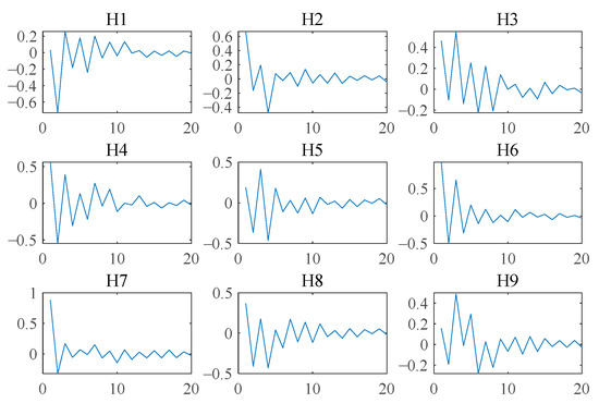 When the source signals are collected, it already includes the influence of the transmission path and the influence of environmental noise to a certain extent. Furthermore, an FIR filter with unilateral oscillation attenuation of order R = 20 is used to convolute the source signals to simulate the process of convolution mixing of source signals by the vibration transmission path. The dimension of the filter is , and its time-domain diagram is shown in Figure 8. The convolution mixing process is , where is the causal reversible filter of order R = 20, is the source signals, and is the observed signals.