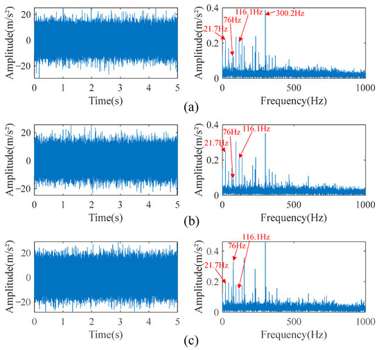 The Gaussian white noise with SNR = 0 dB is added to obtain three simulated observed signals of composite faults collected by the accelerometer, shown in Figure 9. In Figure 9, the impact of the time-domain waveforms in the observed signals is submerged, and the frequency components of the envelope spectrums are chaotic. The frequency domain of each observed signal contains different proportions of characteristic frequencies from the inner race fault signal, outer race fault signal, and normal signal, in addition to strong noise components, so it is difficult to directly diagnose all faults through observed signals.