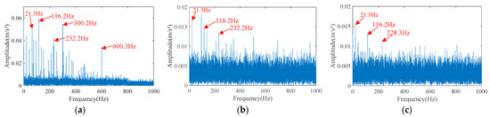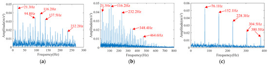 The envelope spectrum of the enhanced separated signals separated by EHVA. (a) Separated signal 1. (b) Separated signal 2. (c) Separated signal 3.