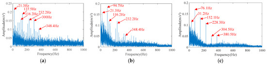 The envelope spectrum of separated signals separated by HVA. (a) Separated signal 1. (b) Separated signal 2. (c) Separated signal 3.