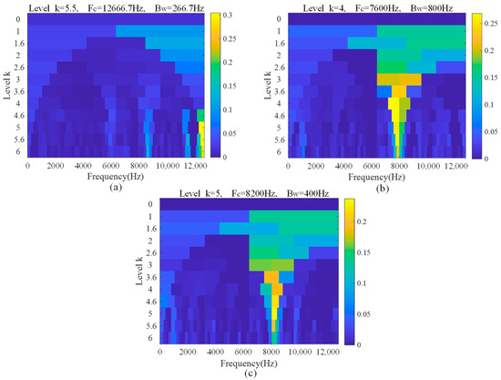 Kurtogram of three separated signals. (a) Separated signal 1. (b) Separated signal 2. (c) Separated signal 3.