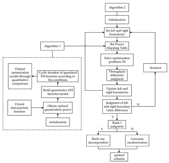 Figure 1. The flow charts of the proposed Algorithms 1 and 2. - The hierarchical optimization method is used to solve the nonconvex optimization problem constructed in this paper. First, the equivalent transformation method is used to transform some constraints into convex constraints. Then, the power mapping table is used to transform the EH requirements constraints that are difficult to solve directly. Secondly, the variable replacement, semidefinite relaxation, binary optimization, and other methods are used to transform the problem into a convex optimization problem. Finally, the convex optimization problem is solved with the help of optimization tools CVX and the optimization algorithm.