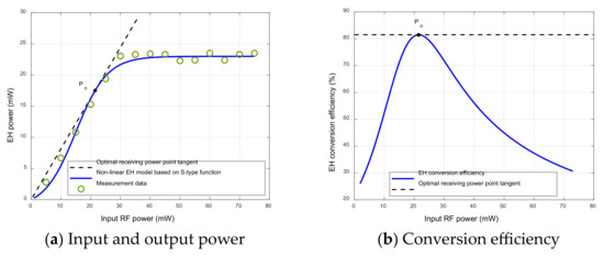 The input and output power figure and the conversion efficiency figure of the single EH circuit. (a) A comparison between the output power for the S-type function EH model in [27] and the measurement data from practical EH circuits in [28]; (b) the conversion efficiency figure of the single EH circuit.