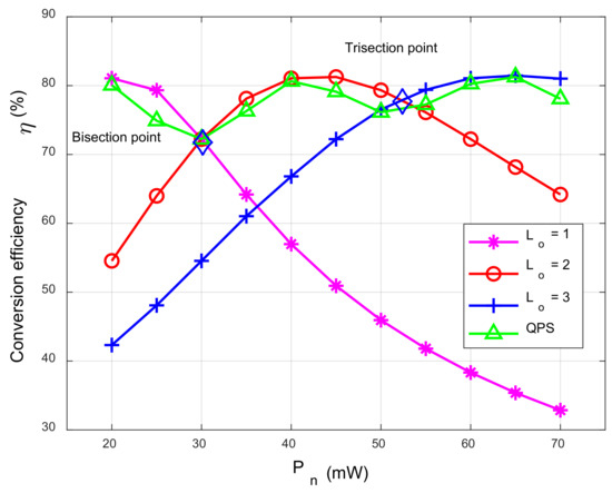 Figure 4 shows the conversion efficiency trend plotted by the reference Algorithm 1, showing the change trend of the input and output conversion efficiency of some EH circuits. With the gradual increase in the input power, when the number of circuits is 1~3, only part of the power segment occupies the optimal EH conversion efficiency; in sharp contrast to this, with the increase in the input power, the conversion efficiency () of the quantified power input curve was around the optimal EH conversion efficiency, fluctuating slightly and tending toward the optimal EH conversion efficiency. It can be seen that the quantized power input scheme has better stability than the optimal shunt input scheme, and the EH conversion efficiency of the QPS receiver tends to the optimal EH conversion efficiency when the input power is large. Therefore, a quantized QPS receiver with stable output EH conversion efficiency is adopted.