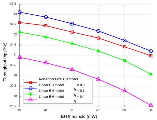 When the transmission power of the BS was fixed, the relationship between the system throughput and the EH threshold under different EH models is shown in Figure 5. The system throughput decreased with the increase in the EH threshold. Since the BS transmission power remained unchanged, more power was allocated to the EH process. The energy allocated to the ID process was reduced, and the system data transmission rate was reduced. Compared with the steeper curve of the linear EH model, the trend of the nonlinear QPS EH model curve was more realistic. When the conversion efficiency of the linear EH model was set to 0.4 and 0.7, the energy that could be collected by the EH circuit was reduced due to misestimation, which could not meet the user’s energy collection needs; thus, the algorithm designed in this paper allocates more energy to the EH process under the linear EH model. When the linear EH conversion efficiency reached 0.9, as the energy collection circuit reached the saturation zone, the conversion efficiency decreased, and the actual collected energy was less than the theoretical calculation, resulting in the user’s EH requirements not being met. Therefore, compared with the linear EH model, the resource allocation scheme based on the nonlinear EH model can predict the network performance more accurately and meet the user’s EH requirements.