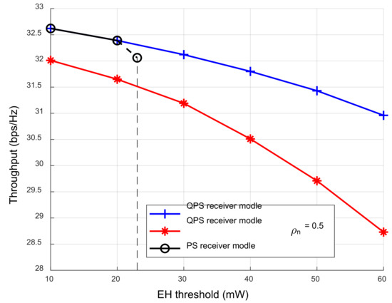 Figure 6 shows the variation trend of the network throughput with user EH thresholds under different receiver architectures. Compared with other receiver models, the QPS receiver model maintained a high network throughput. With the increase in the EH threshold, the energy used to decode the legitimate user information decreased; thus, the system throughput under different receiver models gradually decreased. When the single PS receiver model was adopted, and the EH threshold was greater than 20 mW, the EH capacity range of the PS receiver exceeded the EH threshold and could not meet the user’s EH requirements. When the EH threshold was greater than 23 mW, due to the limitation of the saturated output power (the saturation output power threshold was 23 mW), the system allocated all the energy to the EH process, which still could not meet the user’s EH requirements, and the system could not perform the ID process. Although the limitation of saturated output power could be avoided by using a QPS receiver model with a power splitting ratio of 0.5, the reachable network throughput was lower than that of the QPS receiver model, because the receive power splitting ratio was not optimized.