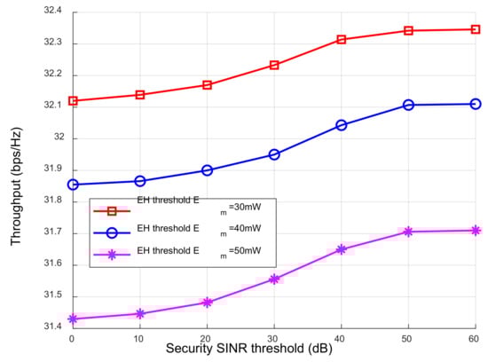 The relationship between the system throughput between the different EH thresholds and the safety SINR thresholds is shown in Figure 7. The system throughput increased with the increase in the safety SINR threshold. The reason is that when the security SINR threshold of eavesdropping users increased, the power allocated to the AN decreased, and the energy used for the ID processing of legitimate users increased, resulting in greater system throughput. When the security SINR was constant, the system throughput decreased with the increase in the EH threshold. The reason is that the energy used for the ID decreased with the increase in the user’s EH requirements, resulting in the decrease in the information transmission rate.