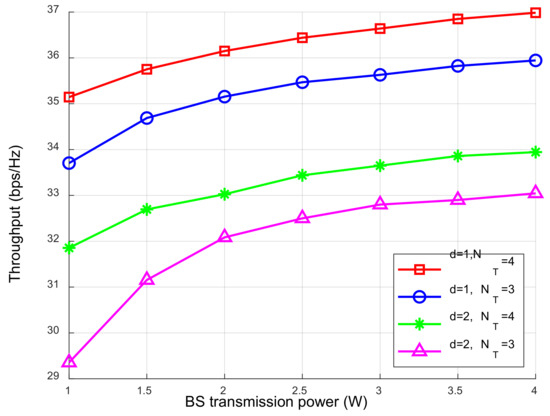 The relationship between different BS transmission powers and network throughputs is shown in Figure 8. The network throughput increased with the total transmission power of the BS. This is because when the network EH threshold and security SINR remained unchanged, the energy used for the ID increased with the increase in the BS total transmission power, resulting in greater network throughput. When the transmission distance was constant, the network throughput increased with the increase in the number of the BS antennas. The reason is that the channel gain of SWIPT system increased with the increase in the number of the BS antennas, and the transmission quality of the signal increased. When the number of the BS antennas was constant, the network throughput decreased with the increase in the distance between the BS and the user. The reason is that with the increase in the transmission distance between the user and the BS, the signal transmission path loss increased, which made the channel transmission quality worse, resulting in a decrease in network throughput.