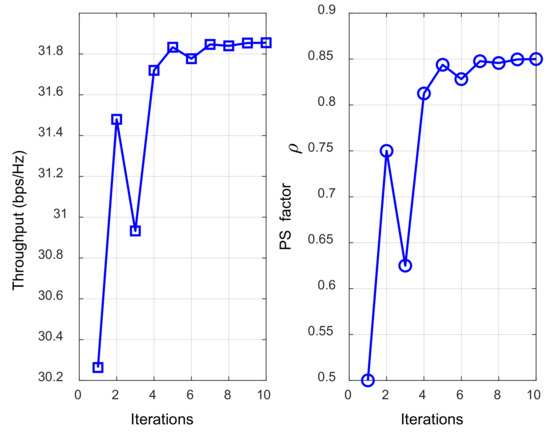 The convergence of the joint optimization algorithms based on the quantized EH and dichotomous method is shown in Figure 9. Due to the advantages of the dichotomous method and the range of the PS factor being (0, 1), in the first five iterations of the network throughput and the PS factor, the search range of the optimization variables of the algorithm was rapidly narrowed, and the range of the optimal value was approximated. Then, the algorithm began to refine the search, converged at the tenth iteration, and the PS factor and network throughput reached the optimal value, indicating that the joint optimization algorithm had good convergence.