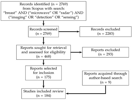 The Scopus search engine was used to identify all papers published before February 17th 2023 that satisfied these criteria. The search was performed with the following keywords: “breast” AND (“microwave” OR “radar”) AND (“imaging” OR “detection” OR “sensing”), and the search results were limited to journal articles and conference papers. All studies in the search results (n = 2769) were initially evaluated for inclusion based on their title and abstract. The studies that were selected for possible inclusion based on their abstract and title (n = 468) were then evaluated with respect to the inclusion and exclusion criteria. One hundred seventy-five papers were identified for inclusion in this review [11,12,13,14,24,25,26,27,28,29,30,31,33,34,35,36,37,38,39,40,41,42,43,44,45,46,47,48,49,51,52,53,54,55,56,57,58,59,60,61,62,63,64,65,66,68,69,70,71,73,74,75,76,77,78,79,80,81,82,83,84,85,86,87,88,89,90,91,92,93,94,95,96,97,98,99,100,101,102,103,104,105,106,107,108,109,110,111,112,113,114,115,116,117,118,119,120,121,122,123,124,125,126,127,128,129,130,131,132,133,134,135,136,137,138,139,140,141,142,143,144,145,146,147,148,149,150,151,152,153,154,155,156,157,158,159,160,161,162,163,164,165,166,167,168,169,170,171,172,173,174,175,176,177,178,179,181,182,183,184,185,186,187,188,189,190,191,192,195,196,197,198,199,200,201]. Nine additional papers [17,32,50,67,72,180,193,194,202] that were not in the Scopus search results but which nonetheless fit the inclusion criteria were also selected for inclusion in this review. Therefore, there were 184 papers selected for inclusion [11,12,13,14,17,24,25,26,27,28,29,30,31,32,33,34,35,36,37,38,39,40,41,42,43,44,45,46,47,48,49,50,51,52,53,54,55,56,57,58,59,60,61,62,63,64,65,66,67,68,69,70,71,72,73,74,75,76,77,78,79,80,81,82,83,84,85,86,87,88,89,90,91,92,93,94,95,96,97,98,99,100,101,102,103,104,105,106,107,108,109,110,111,112,113,114,115,116,117,118,119,120,121,122,123,124,125,126,127,128,129,130,131,132,133,134,135,136,137,138,139,140,141,142,143,144,145,146,147,148,149,150,151,152,153,154,155,156,157,158,159,160,161,162,163,164,165,166,167,168,169,170,171,172,173,174,175,176,177,178,179,180,181,182,183,184,185,186,187,188,189,190,191,192,193,194,195,196,197,198,199,200,201,202]. Figure 1 displays this review methodology.
