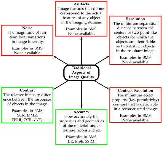 Traditional aspects of medical image quality [19] and existing image quality metrics in breast microwave imaging. Aspects described in boxes with red borders have not been addressed in the BMS literature; aspects in boxes with green borders have been addressed in the BMS literature.