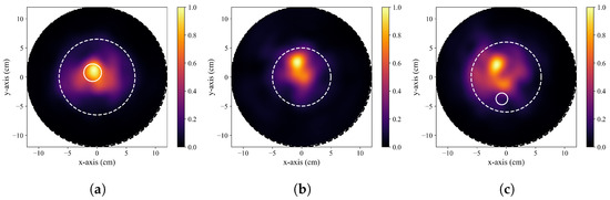 Coronal DAS reconstructions of breast phantoms from the open-access dataset presented in [118]. The dashed white lines indicate the approximate phantom boundary, the black dashed lines indicate the antenna trajectory during the scan, and the solid white circles in (a,c) indicate the known tumour positions. (a) Displays a reconstruction with a tumour response that corresponds to the known tumour position, (b) displays a reconstruction of a phantom that did not contain a tumour but has a prominent tumour-like response (a false-positive), and (c) displays a reconstruction of a tumour-containing phantom that has a prominent tumour-like response that does not correspond to the known tumour position (a false-positive).