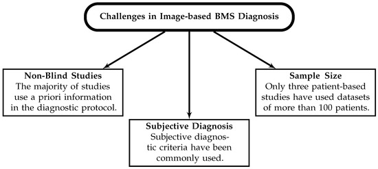 Current challenges in image-based estimation of the diagnostic performance of BMS. Non-blind studies [100,111,120,141,143,170,201], subjective diagnosis [49,111,141,143,170], and sample size limitations were common [48,143,201].