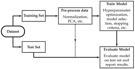 A robust training and testing methodology is essential to appropriately interpret the results obtained with an ML model. A separate, unique, unseen test set is necessary to evaluate the performance of a trained ML model, and no information from the test set should influence the trained ML model. To prevent data leakage, data from the testing set should not be used for pre-processing (e.g., Z-score normalization, principal component analysis, etc.), hyperparameter optimization, or training [206,207]. The most extreme case of data leakage involves using the same samples for training and testing. However, even the use of test set performance metrics to influence the choice of ML model or the choice of ML model architecture qualifies as data leakage and can result in overly optimistic estimates of the model performance [206]. The effect of data leakage can be significant and results obtained when data leakage has occurred must be carefully interpreted and may not be an accurate estimate of the model performance. Figure 5 illustrates appropriate ML methodology.