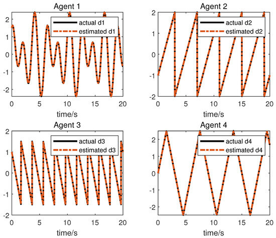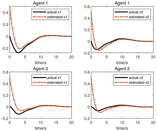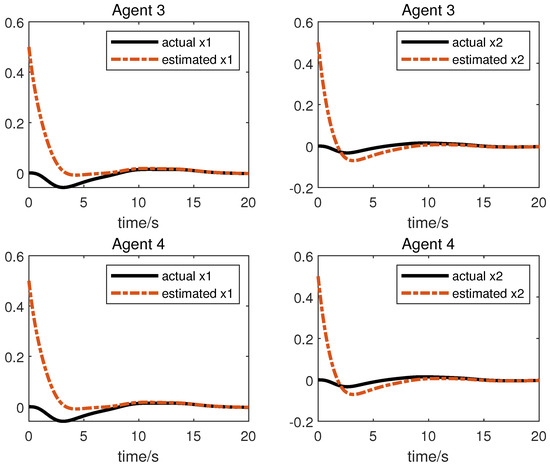 We obtain the following simulation results: The results of the simulation are presented in Figure 2, Figure 3, Figure 4 and Figure 5. Figure 2 and Figure 3 show the state and the estimation of the state by the first equation of UIO (14), showing that the state estimation converges to the state within a finite time. Figure 4 gives the unknown input reconstruction result, proving that the second equation of (14) can realize the reconstruction of the unknown input successfully. The simulation results in Figure 5 indicate that under the distributed UIO-based controller (18), the follower agent state can synchronize the leader agent state within a finite time.