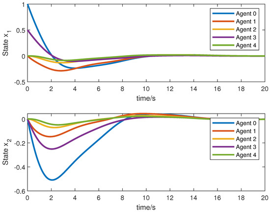 Trajectories of the leader and the follower agents’ states under (18).