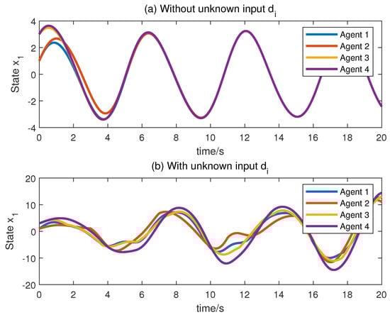 Next, we make a comparison to the work of [32]. In [32], for LPV MASs without unknown disturbances, an observer-based distributed controller whose gain has variable parameters was designed. Figure 6 offers the consensus effects when every agent system does not suffer from unknown disturbance (Figure 6a) and suffers from unknown disturbance (Figure 6b) under the observer-based distributed controller given by [32] (due to space limitations, only the consensus for the state is provided). For the method proposed in [32], from Figure 6a, we find that the consensus can be reached if the system suffers from no disturbance. Figure 6b shows that the method proposed in [32] cannot work well if the system has disturbance. In our method, however, because of the development of the UIO, which can offer the state estimation and unknown input reconstruction asymptotically, and because of the introduction of the UIR into the distributed controller, the asymptotic convergence consensus can still be accomplished even if every agent in the MAS suffers from unknown disturbance. Therefore, we can conclude that our method has the advantage that the distributed controller has a strong ability to deal with unknown inputs. One of the disadvantages of our method is that its structure is relatively complex, requiring the design of an interval observer for each follower agent.