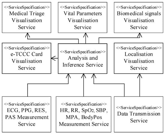 A service taxonomy viewpoint (S1) is shown in Figure 2. The services offered by the DSS-MEDEVAC system reflects the capabilities that are required (shown in Figure 1). The main service group is responsible for visualization of the information that is concerned with the triage decision, soldier’s localization, vital signs, biomedical signals and electronic TCCC card. The important service required by the system is also the data transmission service, which ensures reliable data distribution over all the players in the system.