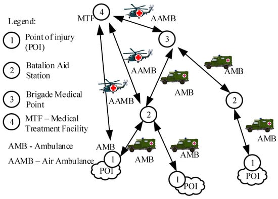 The operational viewpoint of the medical evacuation actions where the DSS-MEDEVAC system is planned to be employed is shown in Figure 3. Wounded soldiers are firstly evacuated to a secure area at the battlefield (if it is possible) to give them the first aid. Let us name this area the point of injury, where the first professional medical assistance can be delivered by the medical personnel (military ambulance—AMB or air ambulance—AAMB) after reaching this area. The sensors of DSS-MEDEVAC system should firstly react on the life problems of the casualties; thus, medical personnel can be supported by important life parameters at the early stage of the evacuation process. The initial triage is also suggested immediately; thus, the required medical resources can be involved in the medical evacuation process. Additionally, current biomedical signal of the wounded soldiers can be observed before the evacuation and during the en route care (supporting the professional medical instruments). The upper levels of the military evacuation pointed out in Figure 3 can exploit both the electronic TCCC card and the information on the initial and updated triage and the current conditions of wounded soldiers. The operational viewpoint shows the main players involved in the DSS-MEDEVAC systems.