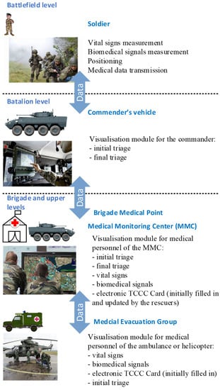 The general information on the soldier’s life-condition (initial and final triage) is visualized by the battlefield management system (BMS) to the direct commander, supporting the current situation awareness. The set of vital signs are constantly sent using the prepared communication protocol via the communication network to the medical monitoring center (MMC), where the data are analyzed to propose the initial and final decision on the triage. This information is then passed to the visualization module available to the medical personnel of the MCC, which can take a final decision on medical evacuation. The medical personnel can also observe the required biomedical signals of the wounded soldiers to additionally support the decision on evacuation or to advice remotely on the first aid. The same information appears in the visualization module of the medical evacuation groups (MEG)—ambulances. The medical personnel of the MEG can change the decision on the triage after direct medical actions at the point of injury. Initially filled in the electronic TCCC card, associated with each wounded soldier, is also updated by the rescuers and is immediately available for medical personnel at each level of the evacuation facilities.