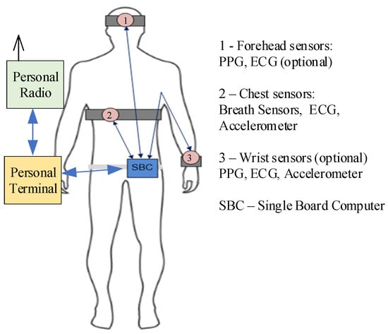 Wearable sensors, constructed by the authors of this paper, are located on the forehead, chest and wrist (optional sensor) of a soldier. They are integrated with a helmet and with an uniform. A single board computer (SBC) based on high-performance arm cortex-M7 microcontroller with low power consumption is responsible for data acquisition from sensors, initial processing of the measured signals, real-time computing of vital signs and communication with personal terminal. To ensure jamming protection, data are transferred to the SBC using wired communication, where wires are to be integrated with an uniform. Both the SBC and sensors are powered by a personal terminal (as a main energy source) or by an internal SBC battery (in a stand-by or emergency mode). It is assumed that the personal terminal is able to deliver required energy to the measurement subsystem during the military mission. The data are sent to other parts of the system via a personal radio which ensures secure and robust tactical communication (even under hostile jamming).
