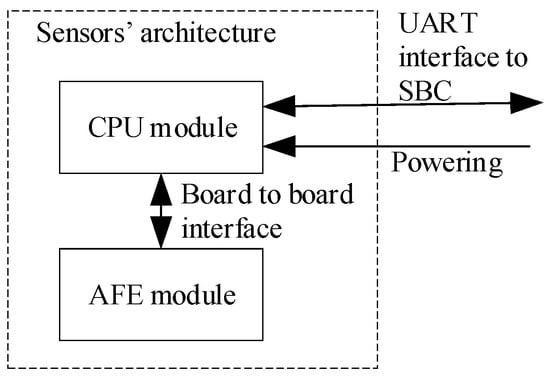 In general, a large set of biomedical signals and vital signs can be measured to support remote health monitoring [,]. Nevertheless, we do not have to use all of them to support a decision on the triage in military operations (or in similar actions). Taking into account the required capabilities of the DSS-MEDEVAC system, specific military conditions, and after deep analysis of the military health care and evacuation procedures [] during military actions, we decided to measure biomedical signals and vital signs pointed out in Figure 1. These signs are supported by information on soldier’s motion and body position (by using of an accelerometer) as shown in Figure 6. On the current stage of the system development, authors prepared a testbed with all required sensors, where each sensor is composed of two main components: CPU (central processing unit) and AFE (analog front end) modules, shown in Figure 7. A sensor is able to communicate with the SBC via two-wires UART (universal asynchronous receiver-transmitter) interface. Such a modular architecture of the sensors allows using dedicated AFE for each sensor with the same CPU module.