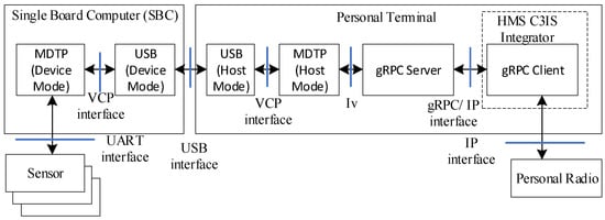 As was already mentioned, the sensors are controlled by the SBC via the UART interface. Next, the data are transferred to the personal terminal using the universal serial bus (USB) interface, where the SBC runs the USB driver with a device mode, while the personal terminal uses the USB driver with a host mode. To coordinate the data transfer via the USB interface, a MDTP protocol (DSS-MEDEVAC data transmission protocol) was elaborated and implemented, both in the SBC (MDTP device mode) and in the terminal (MDTP host mode). Virtual COM Ports (VCP) are used by the MDTP drivers to communicate with the USB drivers. The data are sent to/from the HMS C3IS system using the Google Remote Procedure Calls (gRPC) [], which are transferred by IP packets between the gRPC client and server applications. The gRPC client is a part of the integrator which distributes the data over the DSS-MEDEVAC nodes. The Iv interface is responsible for inter-process communication.