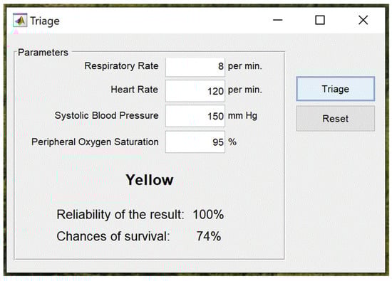 Based on the parameters delivered to the AIS, the algorithms suggested that soldier should be tagged by the (yellow) color. All the vital signs are accessible to the AIS; thus, the reliability of the results is 100%. The SVM network suggests that chance of survival of the soldier is 74%. The final decision on the medical evacuation and the triage is now taken by medical personnel, who can additionally check the required biomedical signals of the soldier.