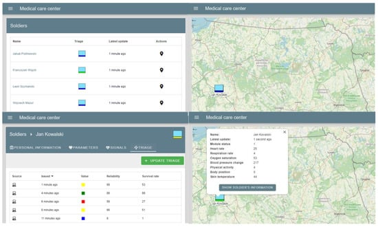 In order to visualize the collected data for operators of Medical Support Groups (MSG)/Battlefield Medical Monitoring Centre (BMMC), the dedicated portal was designed and implemented as a part of the Polish headquarter management system (HMS C3IS JASMINE) []. The portal provides access to information about soldiers monitored by the system. The MSG Portal view adapted to the T5” TRYTON Tactical Computer Terminal is shown in Figure 14. The main view presents basic data allowing medical personnel or commander to be oriented in a battlefield situation: a list of soldiers, the latest outcome of the triage and information about data updates.