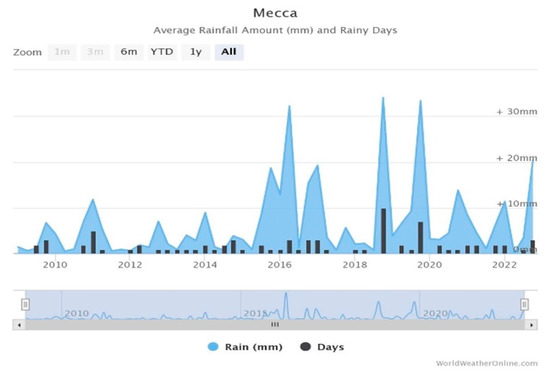 Climate change continues to have an increasing impact on the planet. As a result, cities and other locations worldwide have experienced an increase in extreme weather events such as rainfall, resulting in increased flooding that has damaged private and public property, reducing insurance coverage. Mecca has been impacted by climate change in the last decade as floods have increased despite the city’s location in the Arabian Gulf, which has a hot and wet climate. According to the General Authority for Statistics in Mecca, curve flood modeling is used to analyze the volume and peak of rainfall between 2010 and 2022. Since 2010, the average peak rainfall has increased by 350%. Mecca experienced torrential rains on 23 December 2022, at least partly because of its location, surrounded by mountains, causing numerous vehicles to be swept away. Figure 1 shows Mecca’s annual average rainfall.