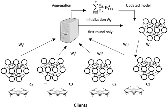 However, various threats exist, such as man-in-the-middle and spoofing attacks. Data collection can be challenging, and stored data may be altered without authorization, raising concerns about their integrity. UAV-supported MEC networks require a distributed learning strategy that enables modeling without publishing raw data [5,6]. In natural disasters, UAVs’ real-time data acquisition can prevent harm by controlling operations efficiently. They can be used to obtain aerial photographs and read water levels, wind speeds, and water speeds to predict weather events, prevent disasters, and aid rescues. To exchange information such as locations, directions, activities, and objectives, multi-drone operations require secure interactions between themselves and the MEC. These complex interactions can be achieved using AI, the computer-based system that executes tasks requiring intelligence. Among the various forms of artificial intelligence, we discuss machine learning (ML), in which training data and other information are used to form predictive models. In machine learning, the model’s predictive ability increases as the amount of training data grows. The idea of utilizing ML and AI in security and privacy is not new, but the development of deep learning algorithms has heightened their importance. Most techniques have been devoted to simulating attack patterns with specific, brittle characteristics before deep learning. With AI and machine learning, systems will be able to resist new, sophisticated attacks with shifting characteristics [7]. Drones must be built with a collective machine-learning model integrating all data from IoT devices and webcams that can be sent to the MEC to create an algorithm with strong predictive capability. Privacy concerns indicate that if all data are stored on a centralized server, anyone can access the drone data, posing a security risk [8]. AI has grown rapidly and successfully due to the tremendous amount of data available. Federated learning (FL) is a new distributed collaborative AI paradigm developed by Google [9]. It coordinates AI training between multiple clients (such as hospitals, banks, and others) without sharing raw data. It is particularly useful for sensitive data such as patient health records, workplace safety information, and personal banking information that needs to be gathered privately and securely for training and testing [10]. By collaborating with different training nodes, FL allows machine learning algorithms to be decentralized. Each node uses its local data and shares model updates, resulting in a single model trained from its local data without the need for centralized data sharing. By distributing computation to different nodes of MECs, federated learning maintains edge devices’ private data, as there is no need to share it with the core network [11,12].
