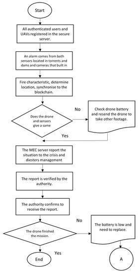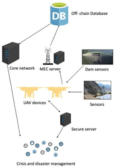 Drones can also be deployed quickly during safe weather breaks that would otherwise ground aircraft. As manned aircraft do not have to worry about collecting footage while searching for and rescuing people stranded by flooding, drones can also capture footage of flood events. During flood events, satellites are often unable to capture useful images due to cloud cover. In the aftermath of floods, assessing the extent of the damage becomes a challenge. Identifying priority areas for cleaning and repair will help communities to recover. Using drones to survey receding water can often be cheaper and easier than traditional plane or helicopter surveys. Drones can also map damage more precisely than satellites, enabling large-scale damage assessments. Decision-makers need accurate flood damage assessments to determine where and how much support is required. Since UAVs can operate in remote and difficult-to-access areas, they can facilitate enhanced situational awareness for emergency response and disaster management applications [77]. Additionally, by using deep learning and an embedded platform, autonomous UAVs can monitor a disaster-stricken area, analyze images in real-time and alert when various calamities occur, such as collapsed buildings, floods, or fires, so their effects on the environment and people can be mitigated faster. Blockchain technology enables data transparency, immutability, and decentralisation.
