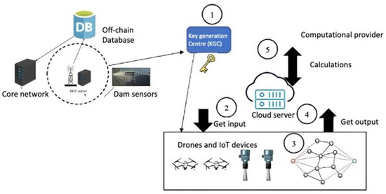 In recent years, Deep Convolutional Neural Network (CNN) technology has gained significant traction in image classification tasks, including automatic classification, object detection, and semantic segmentation [18,19]. Increasing GPU computing and open training datasets have led to the rapid development of CNN models such as AlexNet [20], VGGNet [21], ResNet [22], DenseNet [23], and Inception [24], which are increasingly used in conjunction with Fully Convolutional Networks (FCNs). Deep learning requires many labeled samples to complete the corresponding training, and [25] argues that deep learning can be combined with active learning to reduce the human cost of labeling training samples and improve image classification performance [25]. Using aerial images captured with UAVs in Saudi Arabia, this study employs a DenseNet model and architecture combined with a deep-learning network and active learning. This model uses Federated Averaging (FDA) for SGD. The optimization of the loss function is carried out with SGD, as in most federated learning systems. Every MEC runs SGD on its own private data and periodically synchronizes with other MECs by collecting averages and sharing the optimal solution from all the local MEC models to the central network or server to build aggregated global ML models. Homomorphic encryption will be used to protect gradient privacy in a blockchain-based FL scheme and train the local model for the aggregate global model to preserve privacy. The source data is supposed to maintain security and privacy. In this study, DeepAL is employed in federated learning based on blockchain and homomorphic encryption to detect floods from aerial images captured by UAVs.
