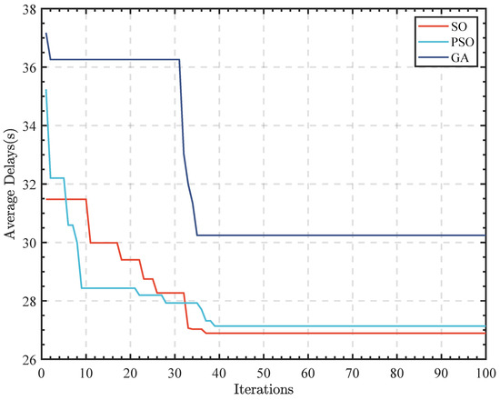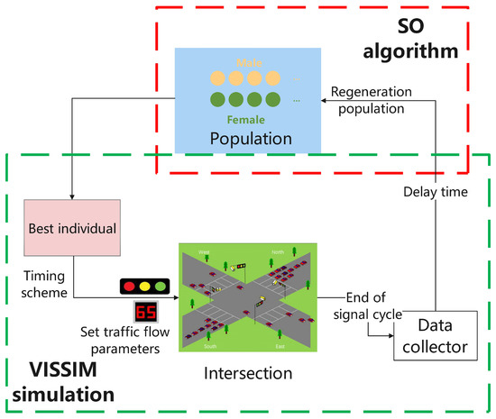 - The timing optimization model can provide better timing solutions. After establishing the optimization objective, the information of each traffic flow obtained by VISSIM is used as the basis for the iterative update of the algorithm, and after optimization of the model using the SO algorithm, the results show that the delay time is reduced by 23.34% compared with traditional fixed timing. The algorithm is also compared with the traditional intelligent optimization algorithms GA and PSO in highlighting the superiority of the algorithm.